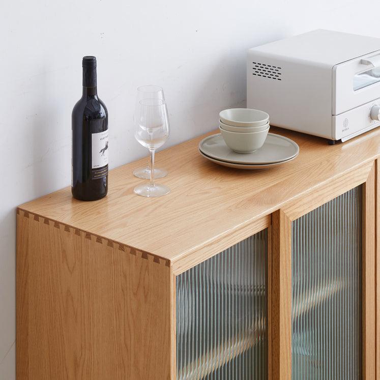 This sideboard adds enough storage capacity as well as a clean minimalist aesthetic to your living or dining room. It has a clean form and is made of wood with a natural finish that complements most styles and color palettes. Glass doors and sliding windows offer a contemporary touch. Adjustable shelves aid in interior space organization and are ideal for kitchenware and media equipment, depending on whether you use it as a buffet or entertainment center. For increased security, two wall anchors are supplied.
