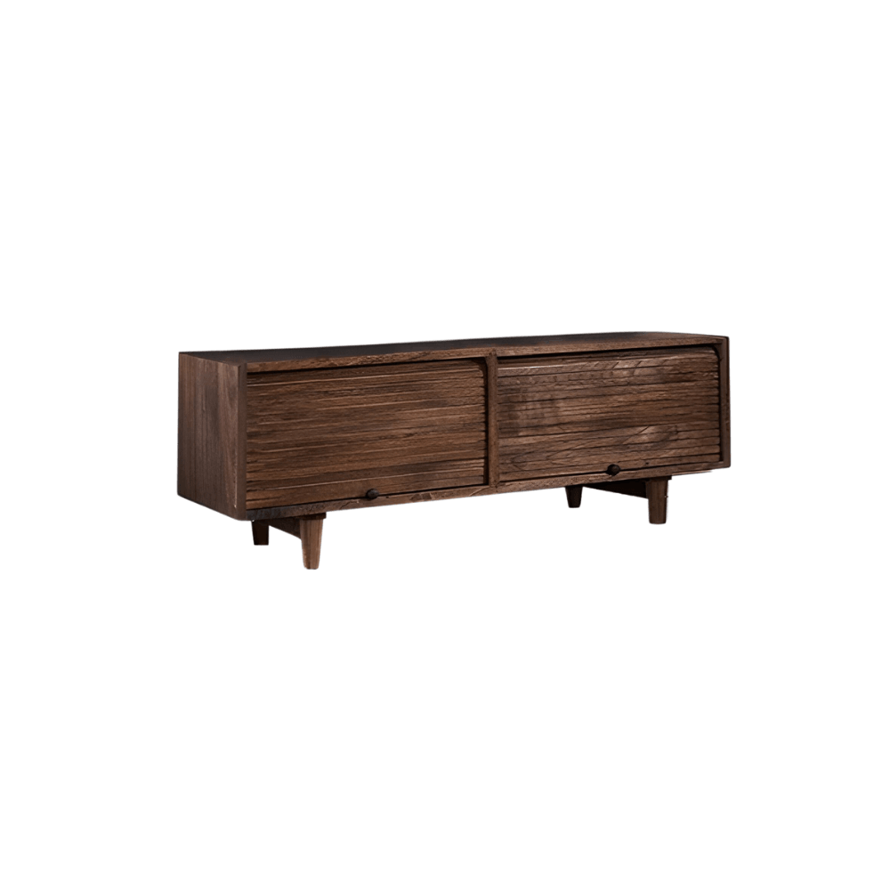 This TV stand will give your living room or den a mid-century contemporary feel. Its stylish design is constructed from solid Paulownia wood in a rich, natural finish, and it stands on four legs in a clean-lined rectangular profile. The cabinets with clean-lined sliding door handles store media accessories out of sight. Furthermore, cable management slots in the back panel keep all those bothersome cables orderly.