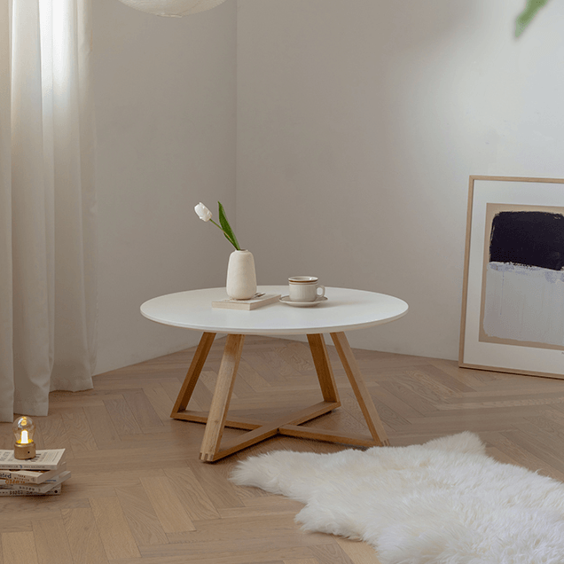 This coffee table will look fantastic in any setting. It may be changed to meet a wide range of styles, from ultramodern to rustic. With its oak cross legs, the table's basic form and solid wood construction make it robust and stable.
