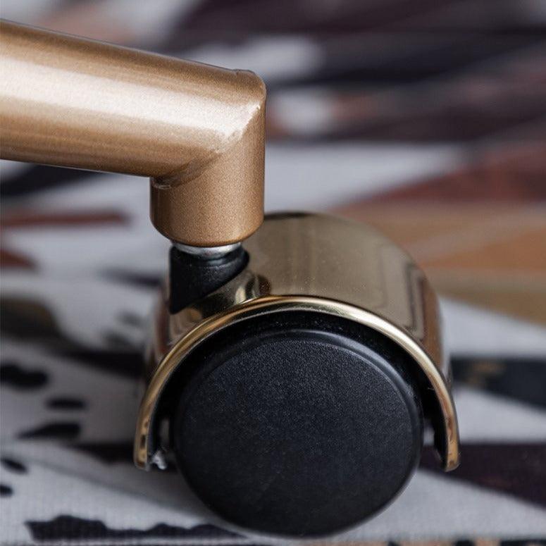 This chair has a five-pronged gold metal base for easy mobility on carpet. This armless chair has a curved, L-shaped back and square seat coated in faux leather and filled with memory foam for plenty of comfort when sitting. It also boasts a swivel design that enables transitioning from one project to the next simple. This chair also has a seat-height adjustment lever and a tilt mechanism to allow you to sit comfortably.