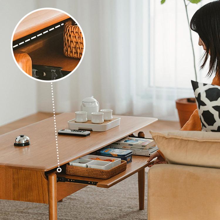 This versatile coffee table has character and rustic appeal, making it suitable for both modern farmhouses and contemporary homes. Its frame is made of solid cherry wood and features a secret pulling panel for storing books or other items. Furthermore, a deep worn wood-grained finish gives it a unique appearance. It has space for staging on top, as well as two drawers for storing things out of sight.
