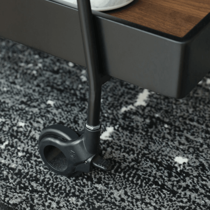 With this movable kitchen island, you can store and serve everything from dinnerware to bar supplies. This multifunctional cart aesthetically mixes industrial appearance and utility with a metal frame and wheels. The bottom basket significantly expands storage space, and the tempered glass surface on top is extremely easy to clean.