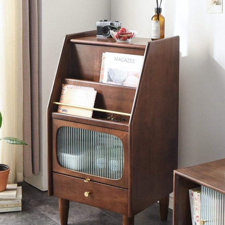 This must-have accent cabinet combines a small footprint with tremendous elegance. It is composed of solid rubber wood and has a clean-lined design for a classic look. The glass door was used to form a checkerboard pattern on the front. This accent cabinet has places to exhibit plants as well as hide books and chargers.